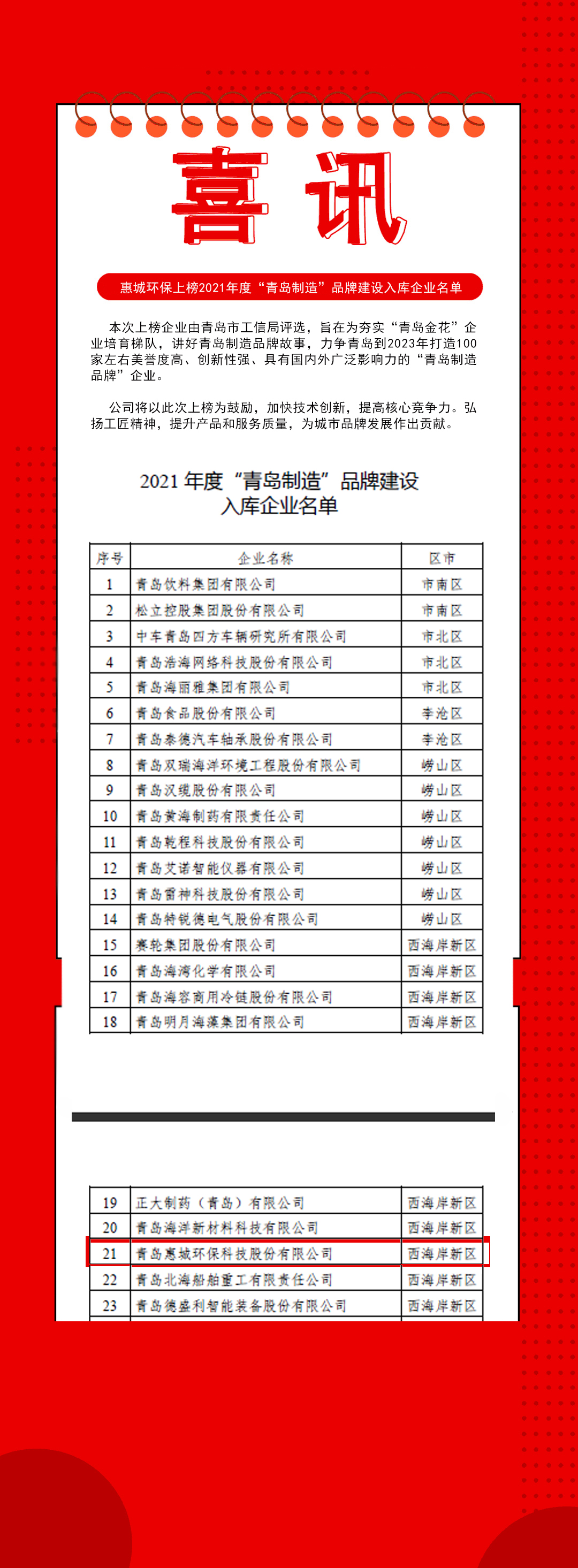 熱烈祝賀公司上榜2021年度“青島制造”品牌建設(shè)入庫企業(yè)名單