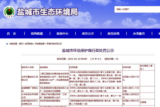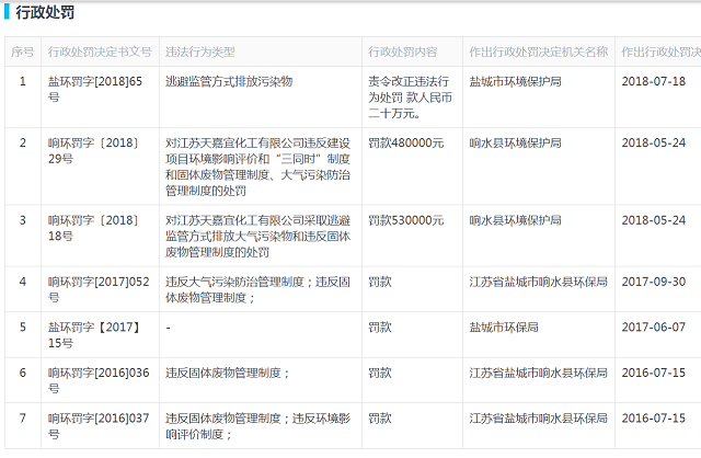 經(jīng)啟信寶查詢,2018年5月24日,天嘉宜化工被響水縣環(huán)境保護局處罰,[響環(huán)罰字〔2018〕29號]決定文書介紹,依據(jù)《建設(shè)項目環(huán)境保護管理條例》第二十三條、《中華人民共和國環(huán)境影響評價法》第三十一條、《中華人民共和國大氣污染防治法》第一百零七條、《中華人民共和國固體廢物污染環(huán)境防治法》第七十五條,天嘉宜化工被罰款480000元。最近的一次是2018年7月18日,因逃避監(jiān)管方式排放污染物,被鹽城市環(huán)境保護局責(zé)令改正違法行為,并處罰款人民幣20萬元。