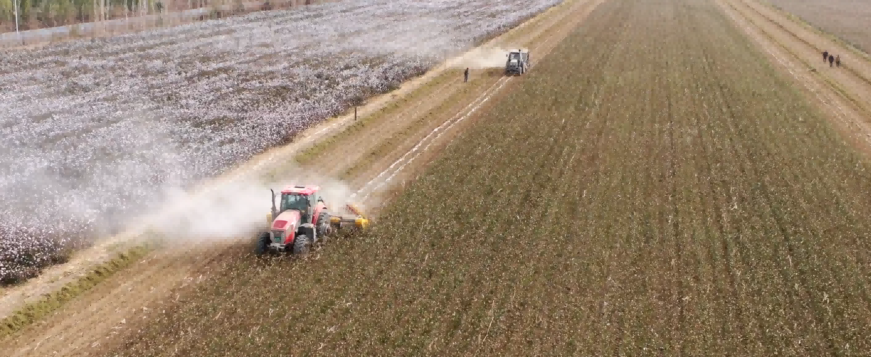 近日,巴州惠疆在尉犁縣及哈密地區的農田殘膜回收工作正在緊鑼密鼓、如火如荼的進行中,打桿機將棉田中的棉桿打斷粉碎處理,打桿機后方的摟膜裝置將鋪在棉田地上的殘膜進行聚攏,殘膜回收機在田地里來回穿梭,殘膜被機器的卷筒快速卷起,集中回收到后置的聚膜框中,機械所過之處,棉田干凈平整,殘膜回收率能夠達到90%以上。?